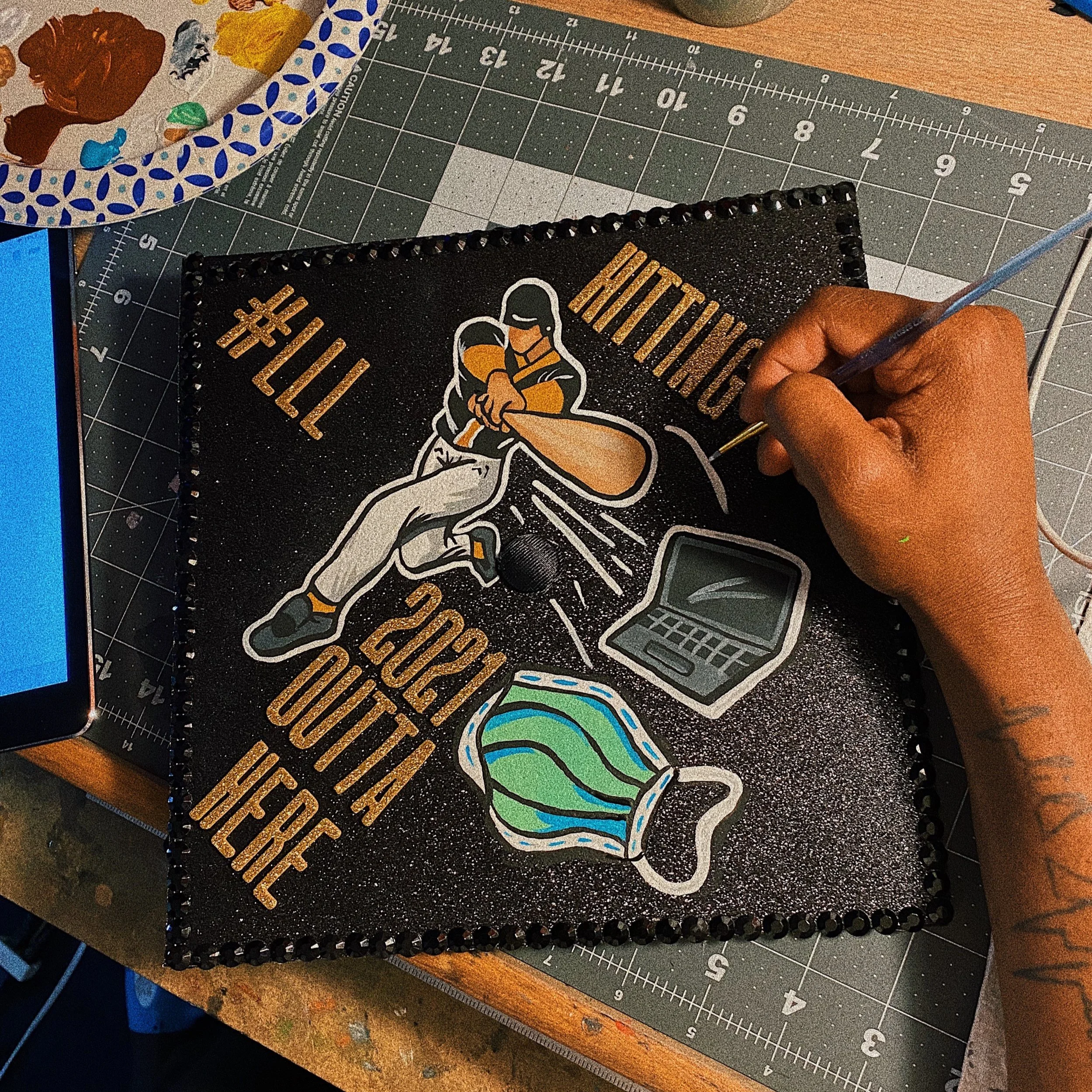 Packaging is very important to us. Unlike other ‘Paint n Sip' companies, Paintngoshop use quality wrapping paper in our packaging and decorates the inside to represent each theme/holiday. We provide a variety of brush sizes, long lasting paint tubes vs clear containers and the opportunity to add more canvases of your choice; including different items. Our non-spill water containers can hold your brushes and we offer juice boxes for kids. Also, It isn’t a vibe without snacks to go with your box! Graduation caps are no different!